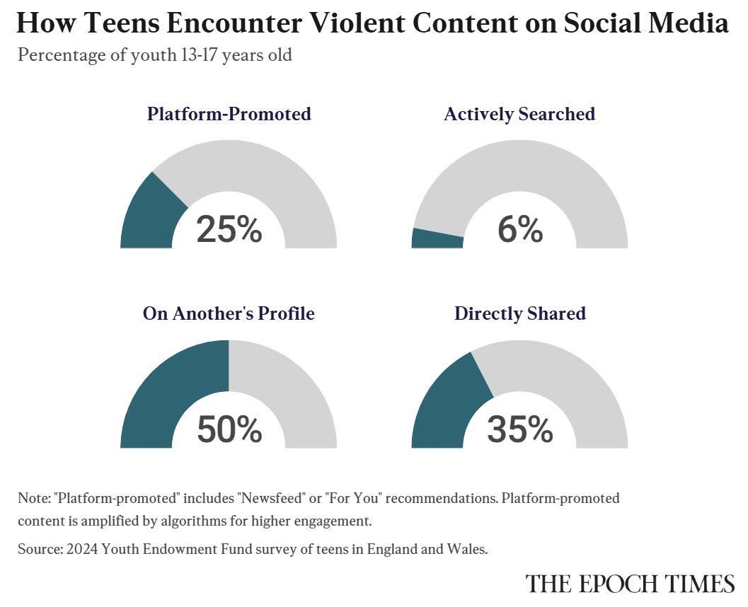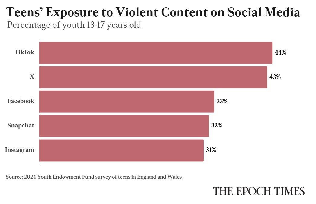 Some 70 percent of youth aged 13 to 17 see real-world violence on social media, according to a 2024 Youth Endowment Fund survey of teens in England and Wales. TikTok users reported the highest exposure at 44 percent of respondents in the preceding 12 months. X users followed at 43 percent, although less than a quarter of respondents reported using the platform. Facebook, Snapchat, and Instagram weren’t far behind, with exposure rates of 31 percent to 33 percent.