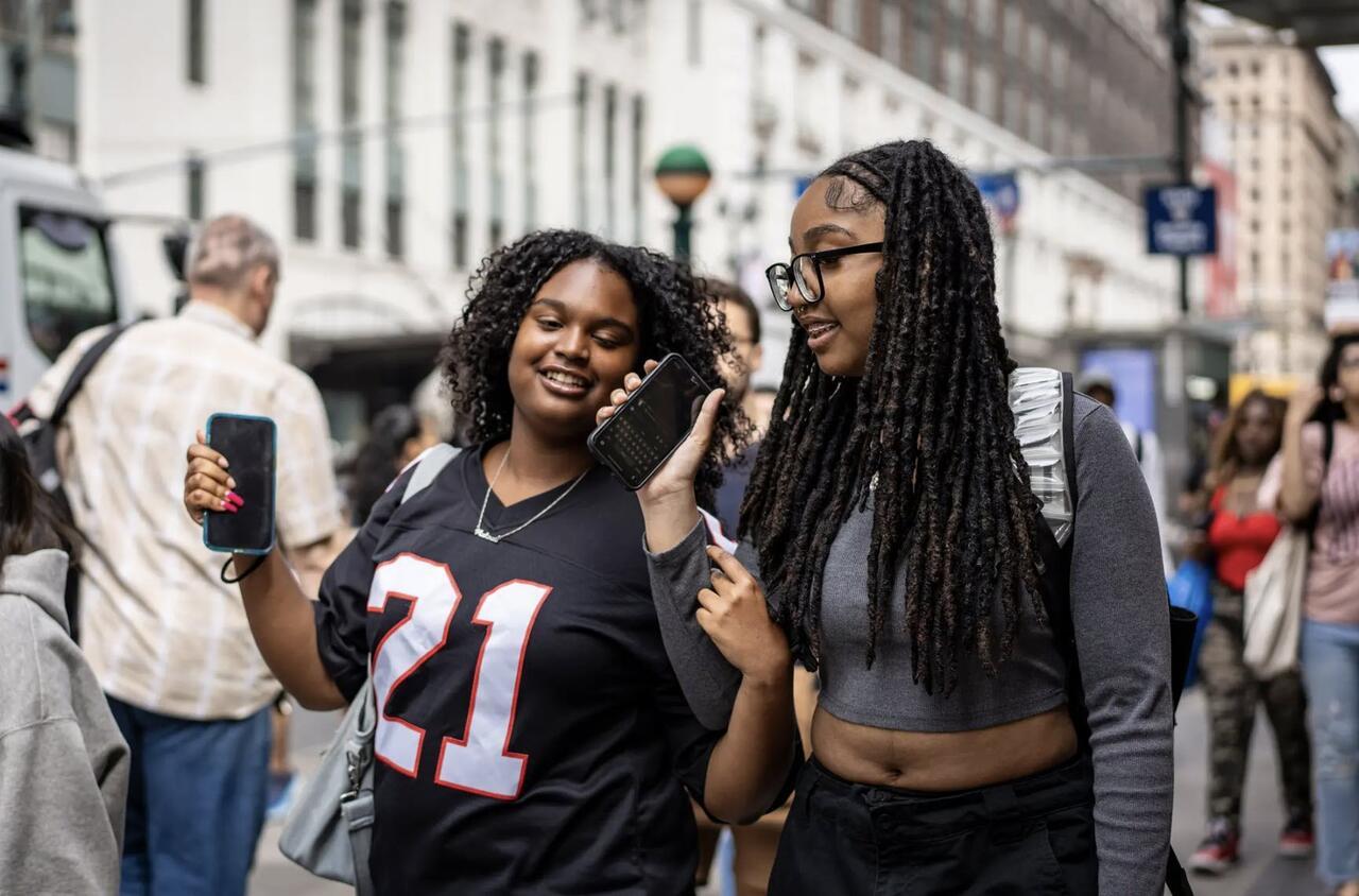 Women with their cell phones in New York City on June 10, 2024. Experts say social media serves as a forum for groups promoting violence, despite platform restrictions. Samira Bouaou/The Epoch Times