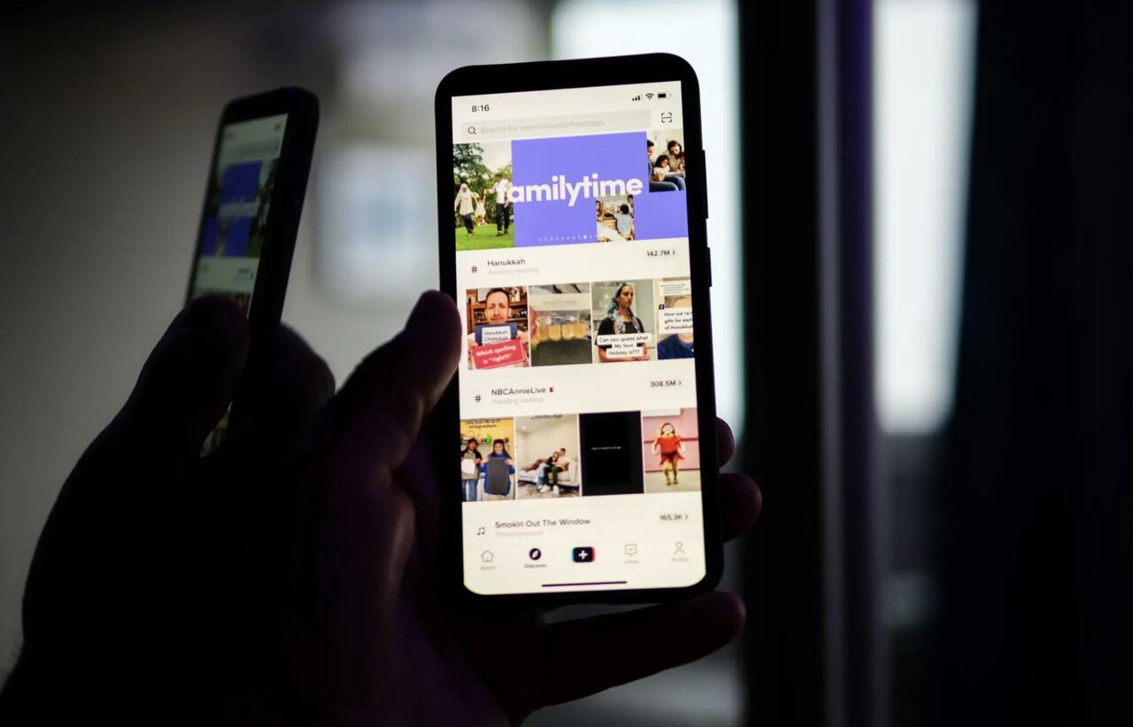 A man holds a phone displaying the TikTok app in a file photo on Aug. 11, 2024. A 2024 survey of teens in England and Wales found that 44 percent of TikTok users reported seeing violent content in the past year. Oleksii Pydsosonnii/The Epoch Times