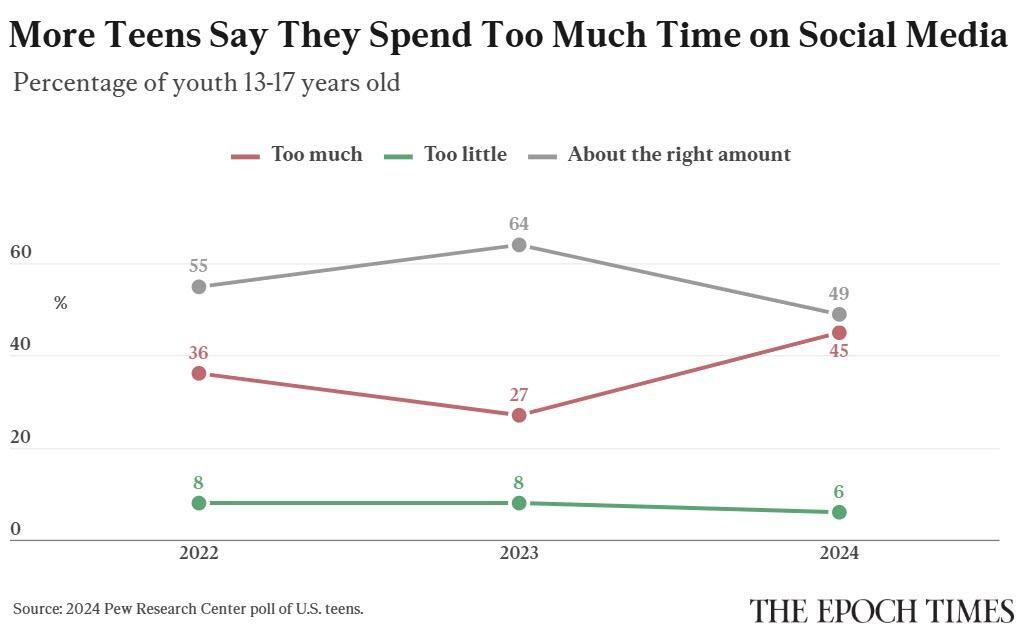 But almost half of teenagers said in a Pew Research poll last year that they spend too much time on social media, up from only about a quarter in 2023.