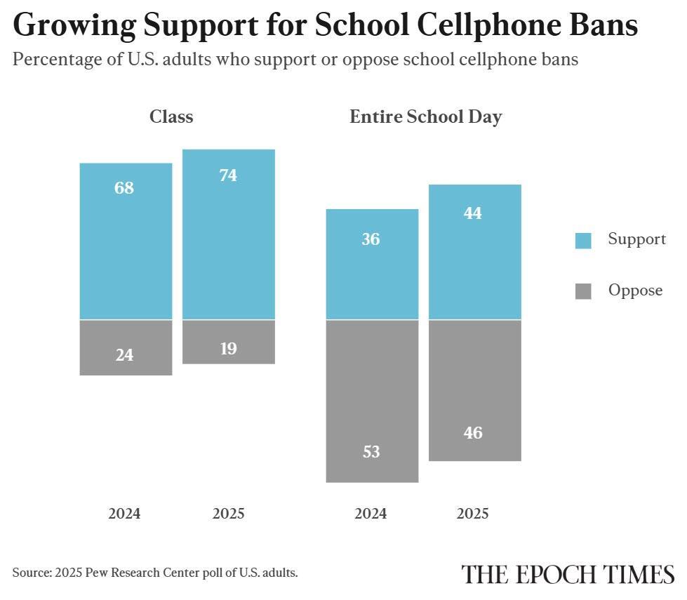 Also, Americans overall seem to be moving closer to the position that children shouldn’t have cellphones, not just during class, but during the entire school day. In 2024, 36 percent supported all-day bans; earlier this year, support for all-day cellphone bans was at 44 percent, according to a Pew Research poll.