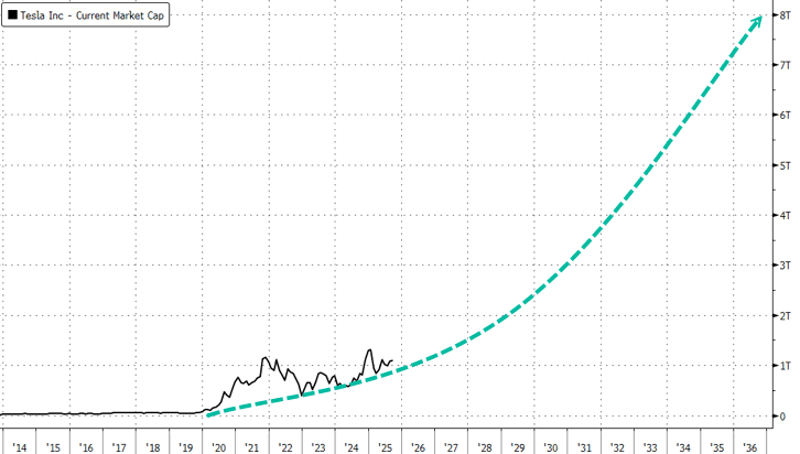 Unlocking the full 423 million-share payout will be challenging. To justify an $8.5 trillion market value - up from about $1 trillion on Friday - Tesla would need to sell 12 million additional EVs, secure 10 million autonomous driving subscriptions, deploy 1 million robotaxis, sell 1 million AI-powered robots, and expand adjusted earnings 24-fold to $400 billion.