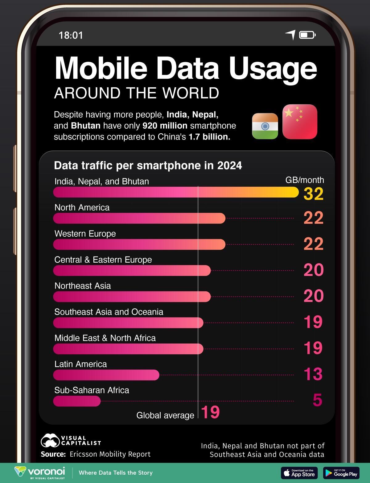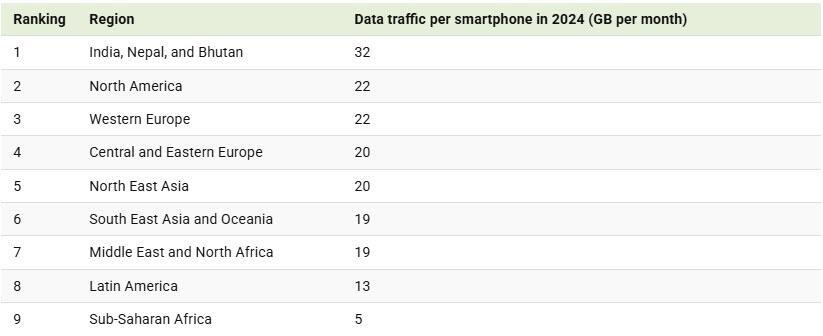 The region of India, Nepal, and Bhutan leads globally, with the highest data traffic per smartphone at 32 GB per monthly, nearly 50% more than North America or Western Europe.