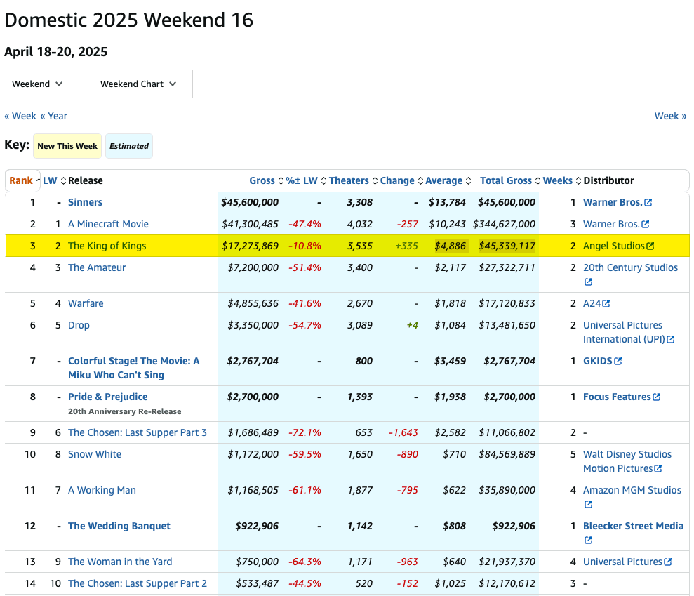 The Christian movie ranked number three on the Domestic 2025 theater list, behind Warner Bro. 's "A Minecraft Movie" in the second spot and Warner Bro. 's "Sinners" in number one. Just for reference, Walt Disney Studios' disastrous "Snow White" is number ten on the list.
