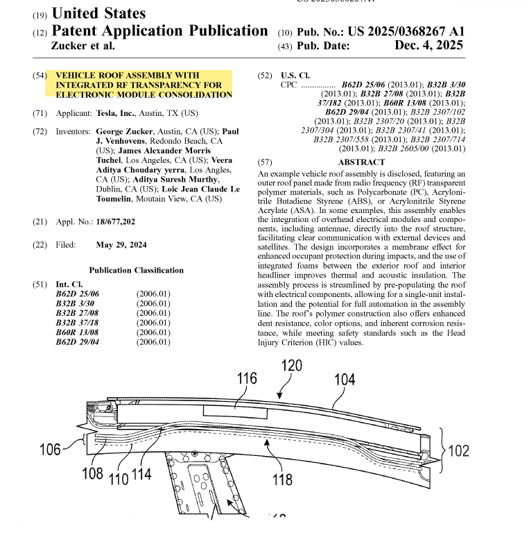 Tesla filed a patent covering a vehicle roof assembly that is transparent to radio frequencies, specifically noting that it allows for satellite communications to pass through.