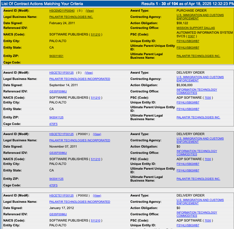Federal data shows Palantir has been an ICE contractor since 2011.