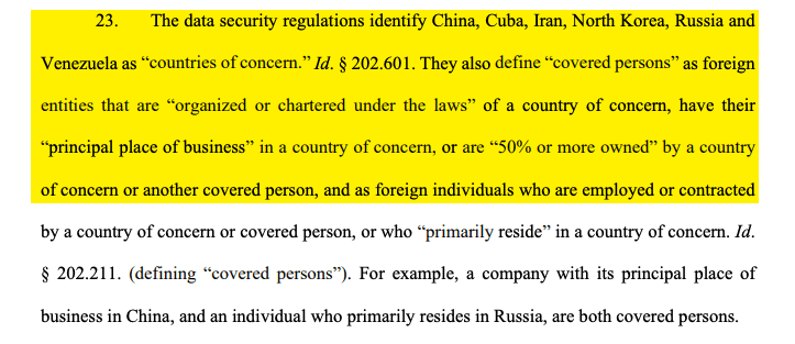 U.S. Attorney Sayler Fleming wrote in a filing that 23andMe is prohibited from selling the genetic data of more than 15 million customers to "covered persons"—companies classified as foreign entities that are 50% or more owned by entities based in countries such as China, Russia, and North Korea.