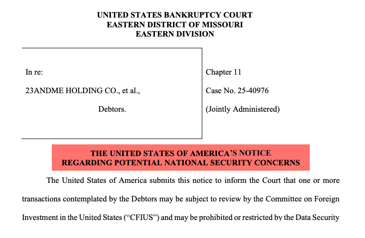 The U.S. Department of Justice submitted a formal notice to the U.S. Bankruptcy Court for the Eastern District of Missouri, which is overseeing the Chapter 11 case of defunct 23andMe Holding Co. (Case No. 25-40976), warning that the potential sale of its assets—including a gigantic pool of millions of Americans' genetic data—may trigger a national security review by the Committee on Foreign Investment in the United States (CFIUS).