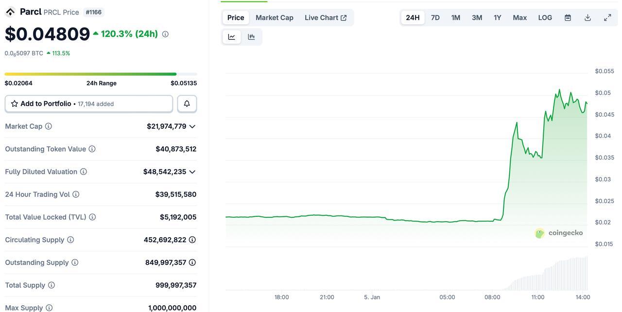 Parcl’s native token, PRCL, was up about 120% over the past 24 hours at time of writing, according to CoinGecko data.