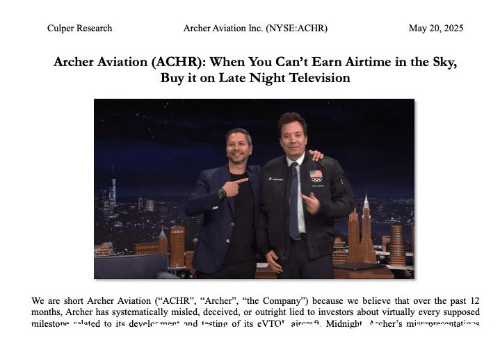 On Tuesday morning, Culper wrote on X, "We are short Archer Aviation - and we're extending a $1 million wager to Jimmy Fallon, who has earned millions to promote Archer. Jimmy - if you truly believe in Archer, prove it."