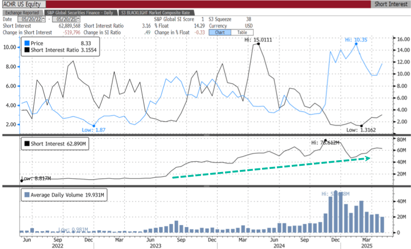 Archer shares are down a little more than 1% in late afternoon trading on Tuesday. According to data from S3 Partners, about 17% of the company's floating stock is short.