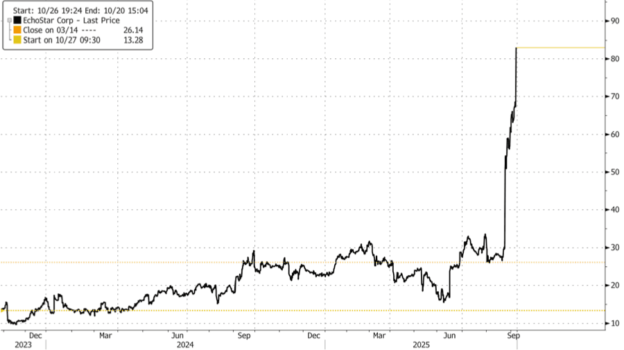 Shares of EchoStar jumped 24% in premarket trading and are up 193% year-to-date as of Friday's close. Short interest stands at 12.37% of the float, or approximately 16.4 million shares, with a 6.1-day average trading volume to cover.