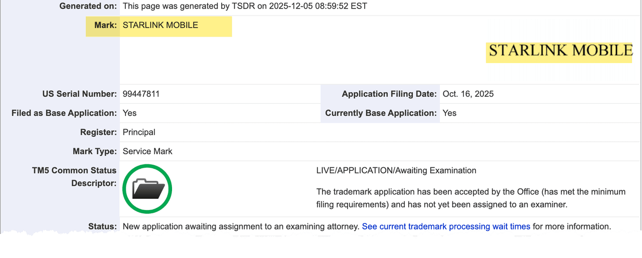 On Oct. 16, Starlink filed to trademark "Starlink Mobile." One X user spotted the application in the United States Patent and Trademark Office (USPTO) records: