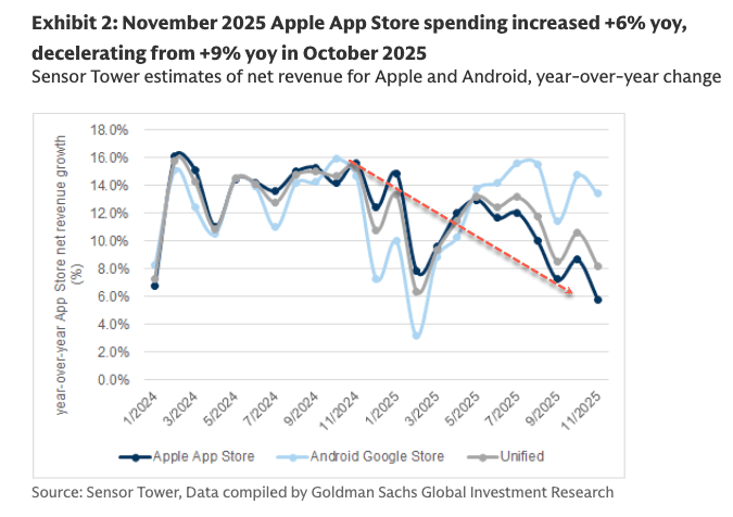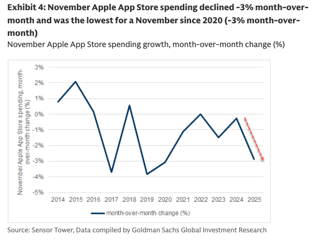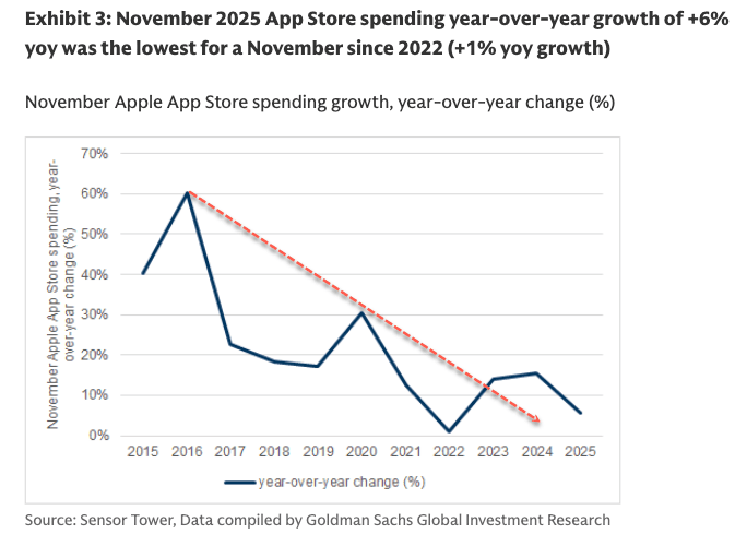 Goldman analysts led by Michael Ng published a note Tuesday citing Sensor Tower data showing Apple App Store spending last month rose just 6% YoY, down from 9% in October and half the growth rate seen in July.