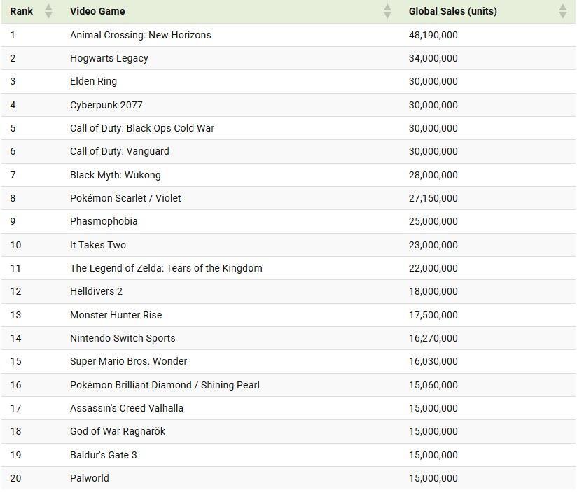 In second place is Hogwarts Legacy with 34.0 million, making the gap between #1 and #2 a sizable 14.2 million units. Hogwarts Legacy had the advantage of being tied to one of the world’s best-known franchises, Harry Potter, and delivered the open-world wizardry experience many fans had been waiting years for.