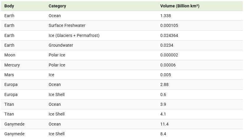 Below is the full breakdown of water volumes by celestial body or source: