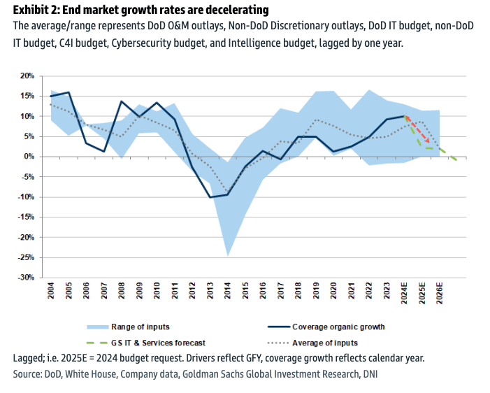Goldman analysts recently downgraded Booz Allen from "Neutral" to "Sell," noting medium-term revenue growth is expected to be flat as federal civilian spending comes under pressure and priorities shift within various federal agencies.