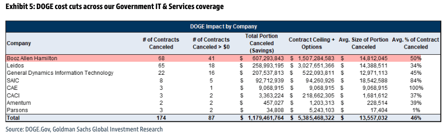 DOGE data shows that Booz Allen has had 68 contracts canceled, with 41 of these being contracts that had not been fully paid out, and the remainder having been fully paid. The 60 contracts account for over $600 million in deals.