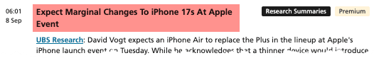 David Vogt expects an iPhone Air to replace the Plus in the lineup at Apple's iPhone launch event on Tuesday. While he acknowledges that a thinner device would introduce a relatively new form factor for the iPhone, he thinks it will have a muted impact on consumer purchasing decisions and thus, limited upside to his iPhone forecasts for the September and December quarters.