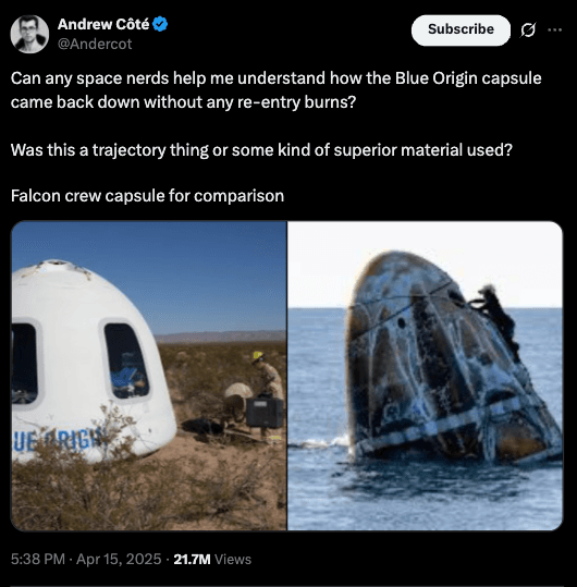 Katy Perry didn’t go to space. Blue Origin barely scraped the Kármán line, then fell back to Earth. No orbit, no true microgravity—just a high-altitude joyride. It’s elite cosplay sold as heroism. Total media-driven fakery. Agree? pic.twitter.com/2m1XAJVrGE