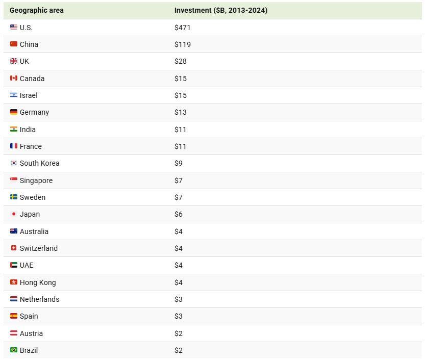 The figures in this graphic represent total private AI investment by country, between 2013 to 2024 in billions of U.S. dollars. Countries that raised less than $1 billion were grouped into the “Rest of World” category.