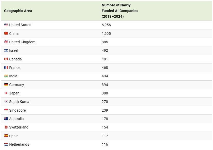 The 2025 AI Index Report also features data on the number of newly funded AI companies by country. Generally speaking, more capital raised results in more companies starting up.