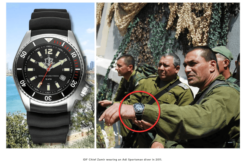 In 2011, then Brig. Gen. Zamir wore a seldom-seen dive watch from a brand called Adi, which is claimed to be the only watch brand built in Israel. Borrowing elements from popular Seiko and Citizen models, Adi’s collection includes numerous models bearing IDF insignia, as well as a version produced for the Mossad, Israel’s foreign intelligence service. The watches appear to be commercially available, though it appears some may have been issued to certain IDF units.