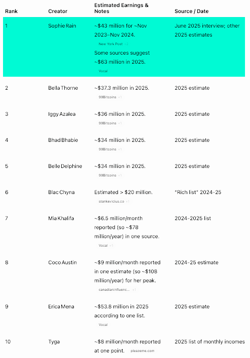Top-earning creators on site in 2024-25 include: