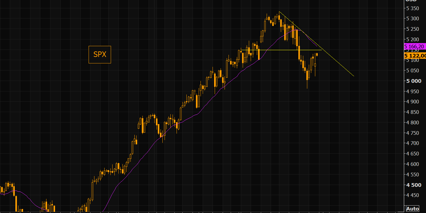 So far this is just a "normal" bounce post the sell off. 5150 is key in SPX to the upside. The short term negative trend line comes in there, as well as the 21 day moving average, sloping negatively these days.