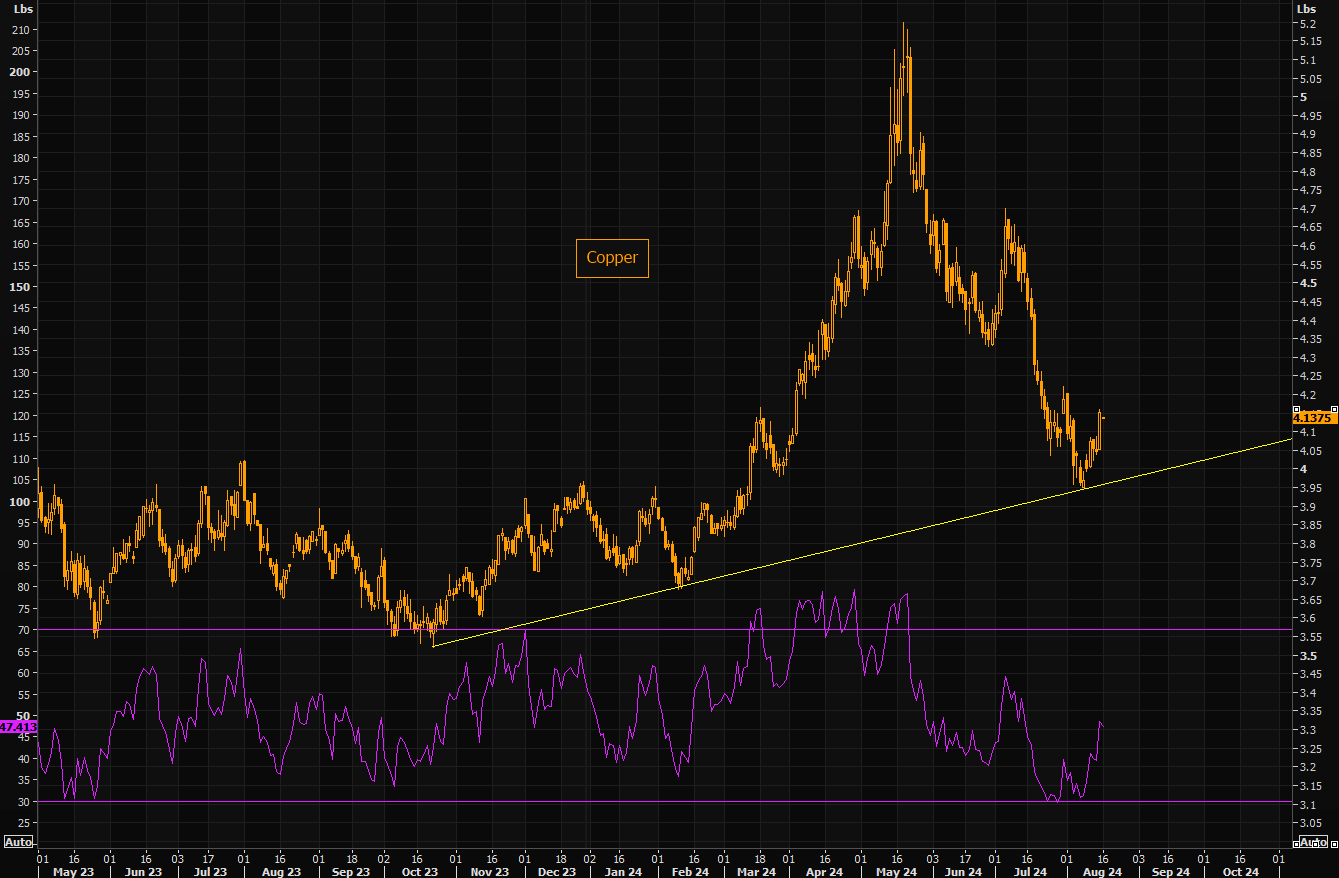 Copper put in one of the bigger up candles in a while in yesterday's session. There is some sort of a longer term trend line we bounced on recently. Note the slightly positive RSI divergence.