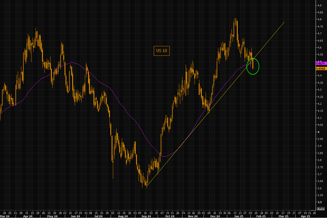 The 10 year is breaking below the trend line that has been in place since September. Note we are trading below the 50 day. That is rare...