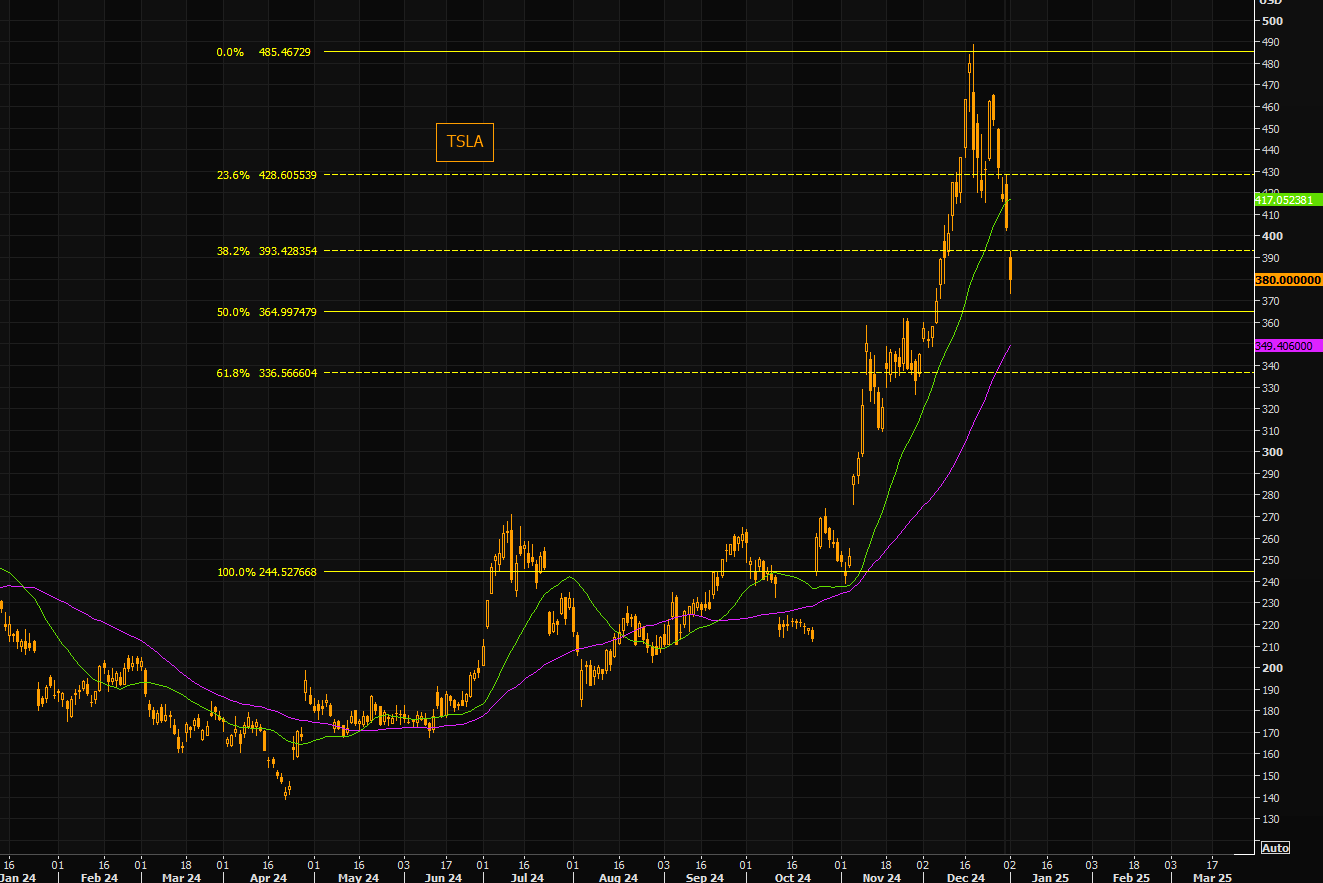 Tesla edition. The stock is well below the 21 day, trading some $30 above the 50 day. Fibonacci levels since the election shows the big 50% retracement level around the $360 area.