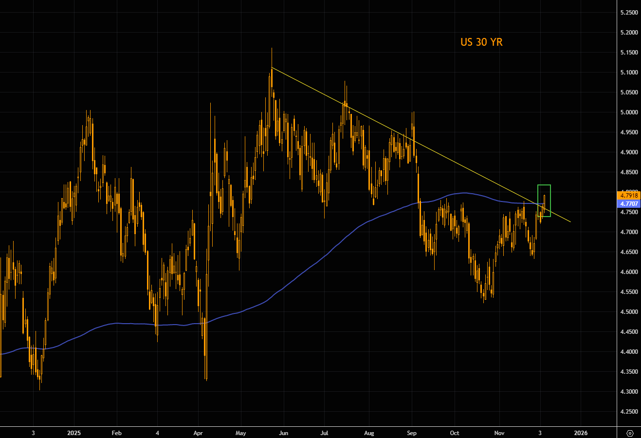 US 30 year taking out the short term negative trend line, trading above the 200 day for the first time in months.