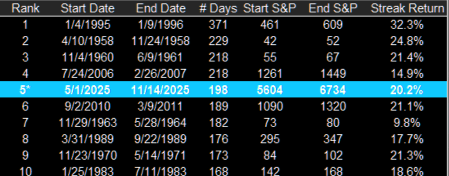 The S&P 500 has closed above its 50-day moving average for 199 consecutive days, the 5th longest streak since 1950. It is extremely rare to see such a smooth ride higher and we should be braced for some proper drawdowns soon. Nevertheless, we continue with our Monday series "Fab Five Fundamentals" that lists five bullish things out over the weekend. And as always, this is not necessarily the true reflection of our current market view - just an exercise to stay humble and not too bearish.