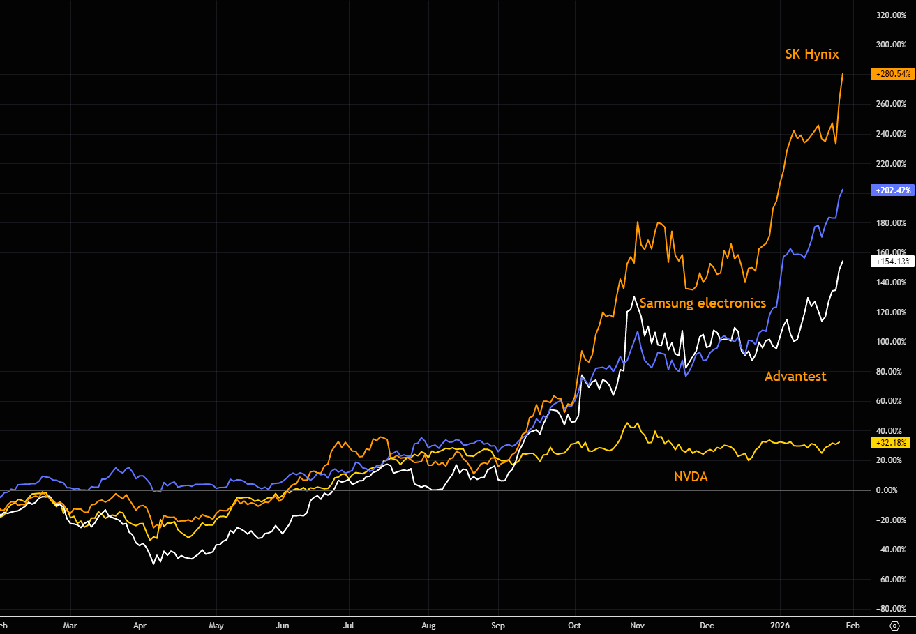 The real AI melt-ups are happening elsewhere. This is a global trade. Chart shows some of those hot Asian names, leaving NVDA way behind.
