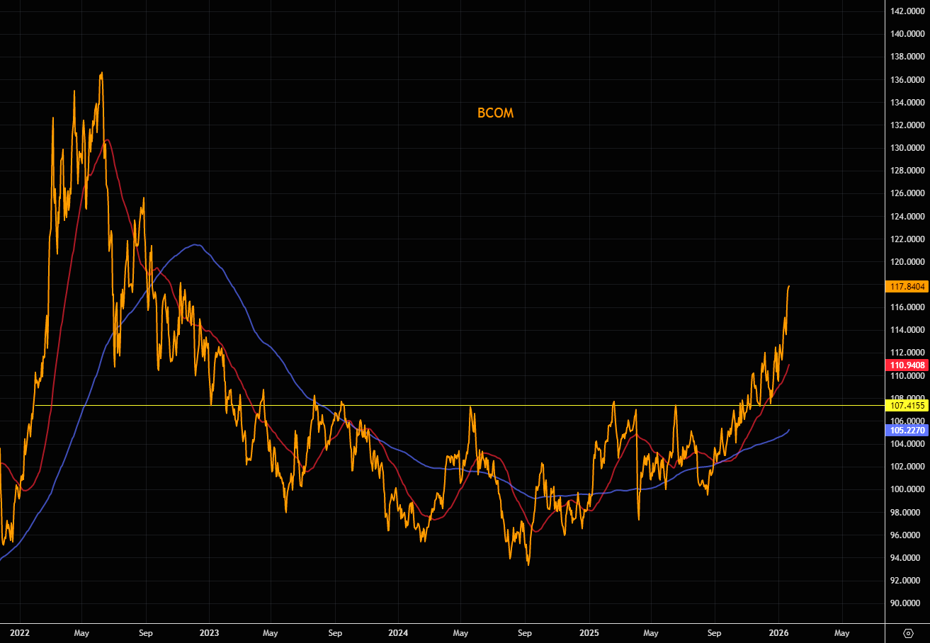 The Bloomberg Commodity Index continues its textbook breakout. We flagged mid-December as a second chance to get in, writing: “We are down to big supports, trading right around the 50-day. Second chance?” Fast forward to today and the BCOM index is up nearly 10%. Price has pushed decisively above the 50-day, but that’s exactly what strong momentum looks like. Note the 200-day is now sloping positively.