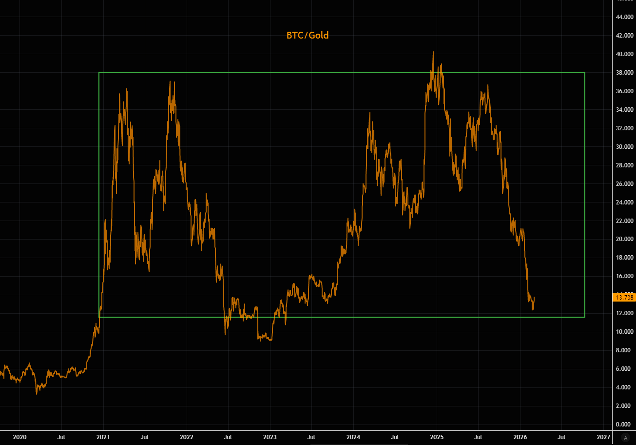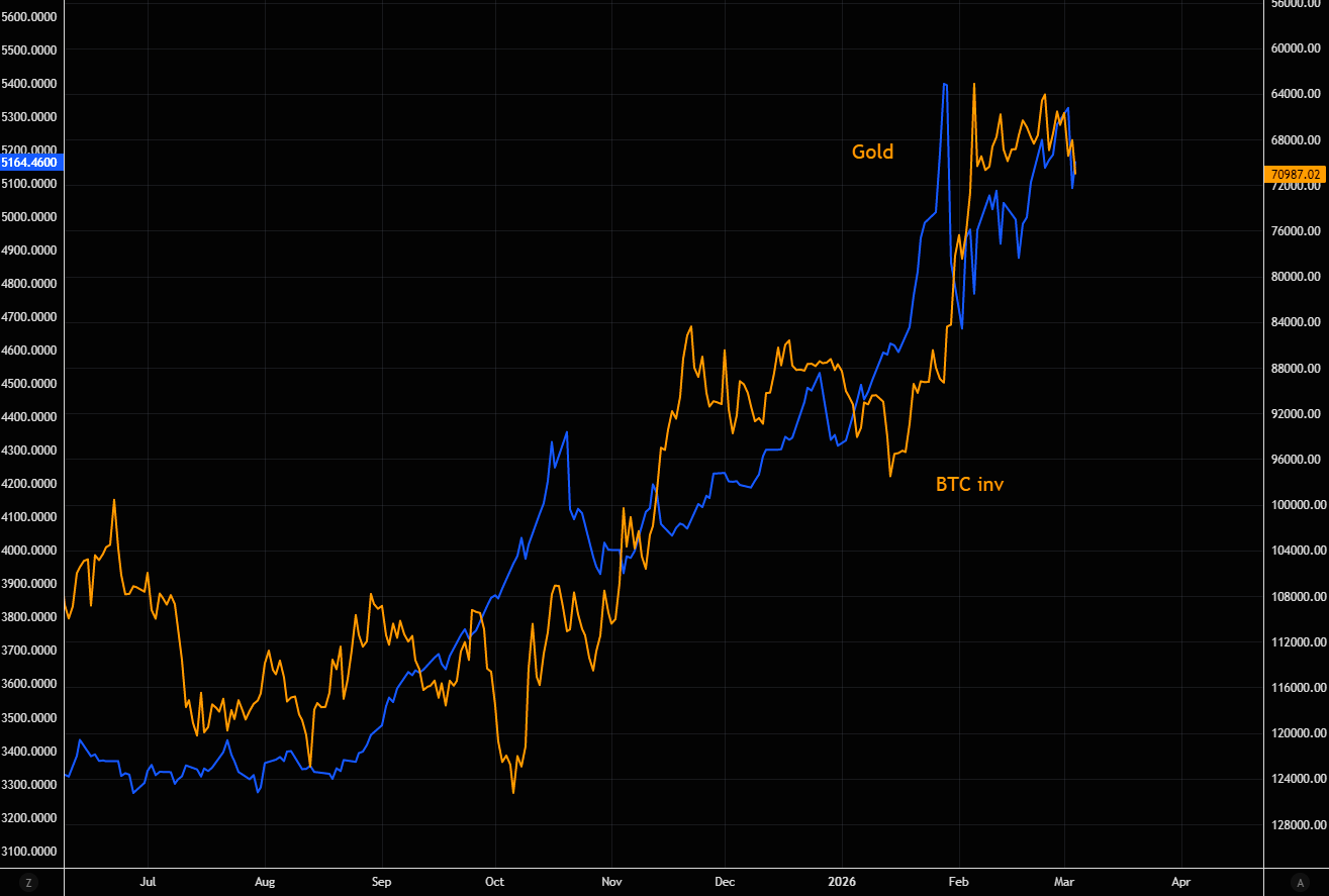 BTC started catching bids just as gold made its latest move lower. Are people ready to switch from physical to digital again? Gold vs. BTC (inverse).