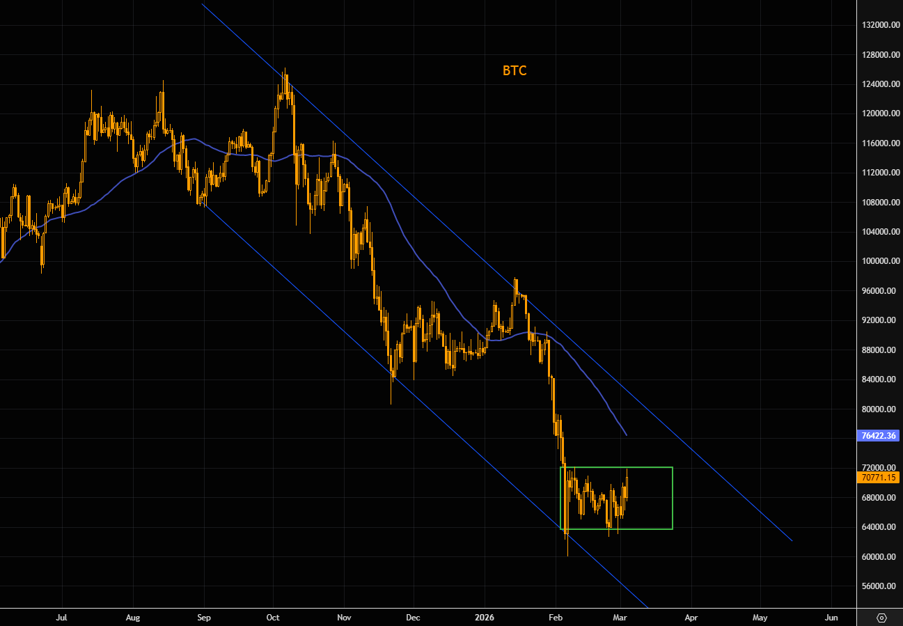 BTC has shown notable resilience during the latest bout of market chaos. BTC is pushing the highest levels since early February. Note that BTC is still stuck inside the range that has been in place since late January. A break above $72k would be the first real technical signal that the consolidation is ending, opening the door for a test of the bigger channel highs and the 50 day MA (currently around $76k).
