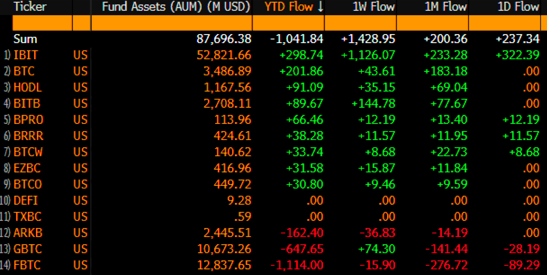 "Another solid inflow day for the bitcoin ETFs. Almost all now net positive flows YTD". (Eric Balchunas).