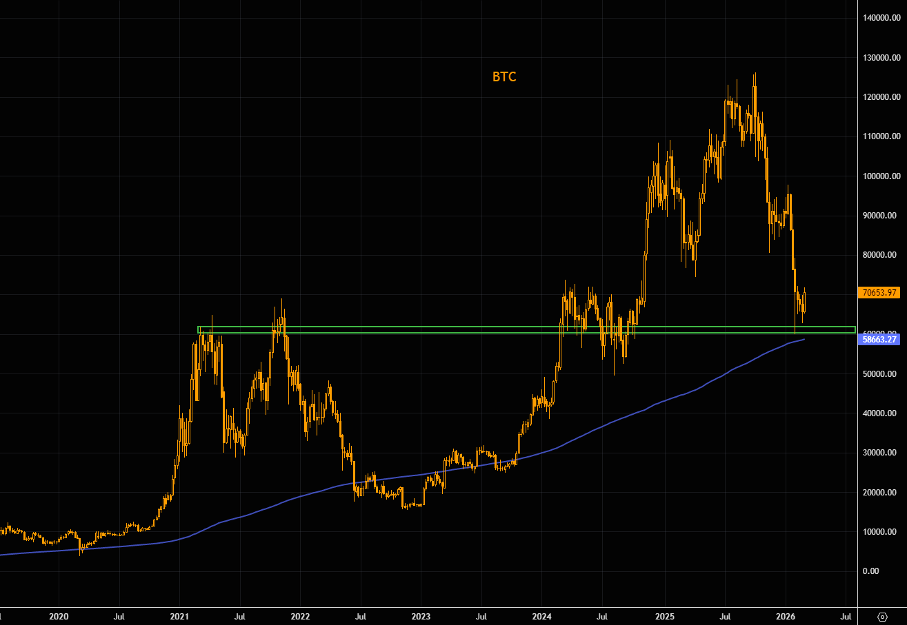 BTC’s longer-term chart shows we almost touched the 200-week moving average, a serious support level that was visited not long ago.