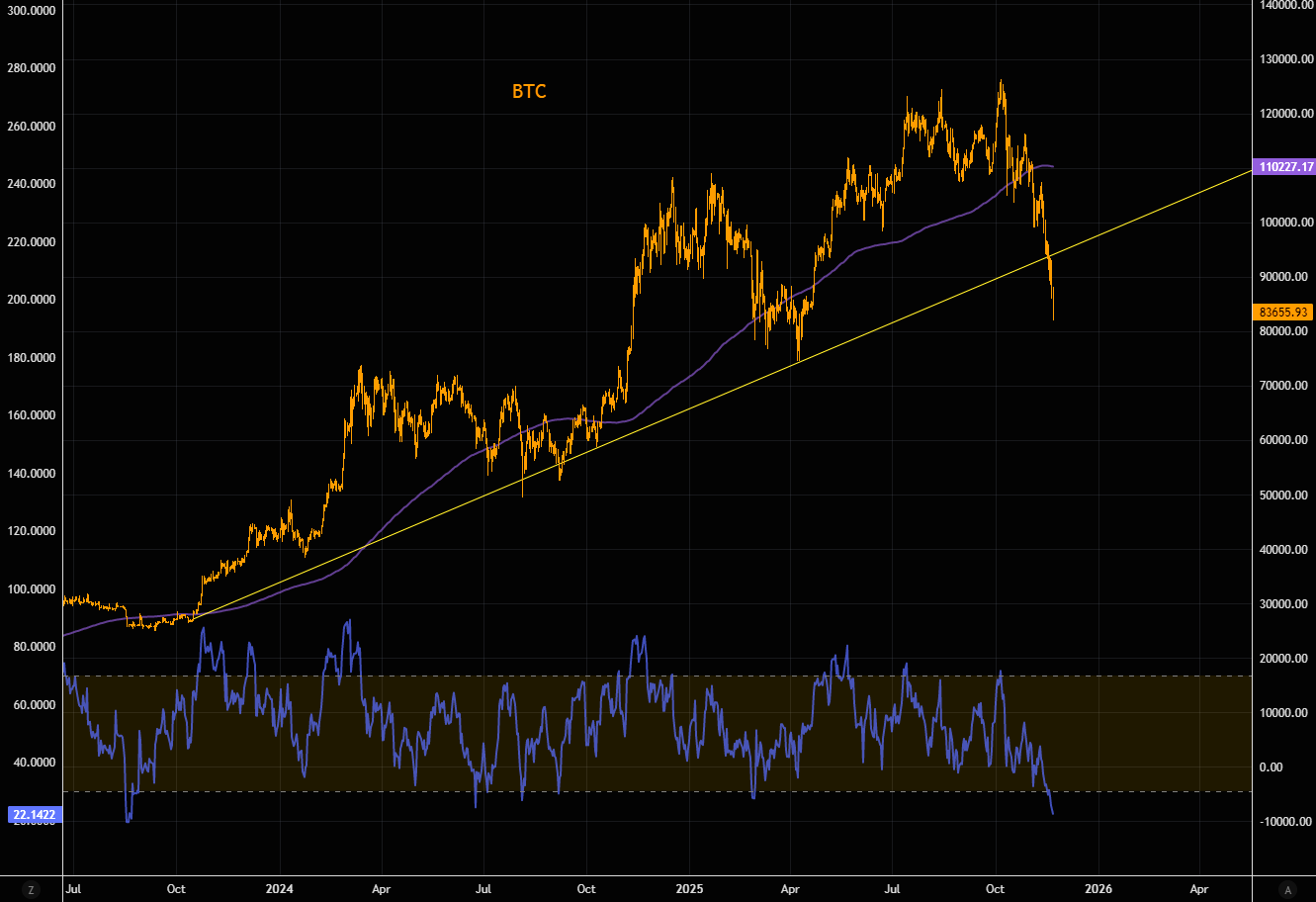BTC is well below the longer term trend line. We haven't seen it trade this much below the 200 day in forever. BTC is at the most oversold levels since last September. RSI at 22 is rather extreme, although we all know, oversold can star oversold for longer than most think possible.