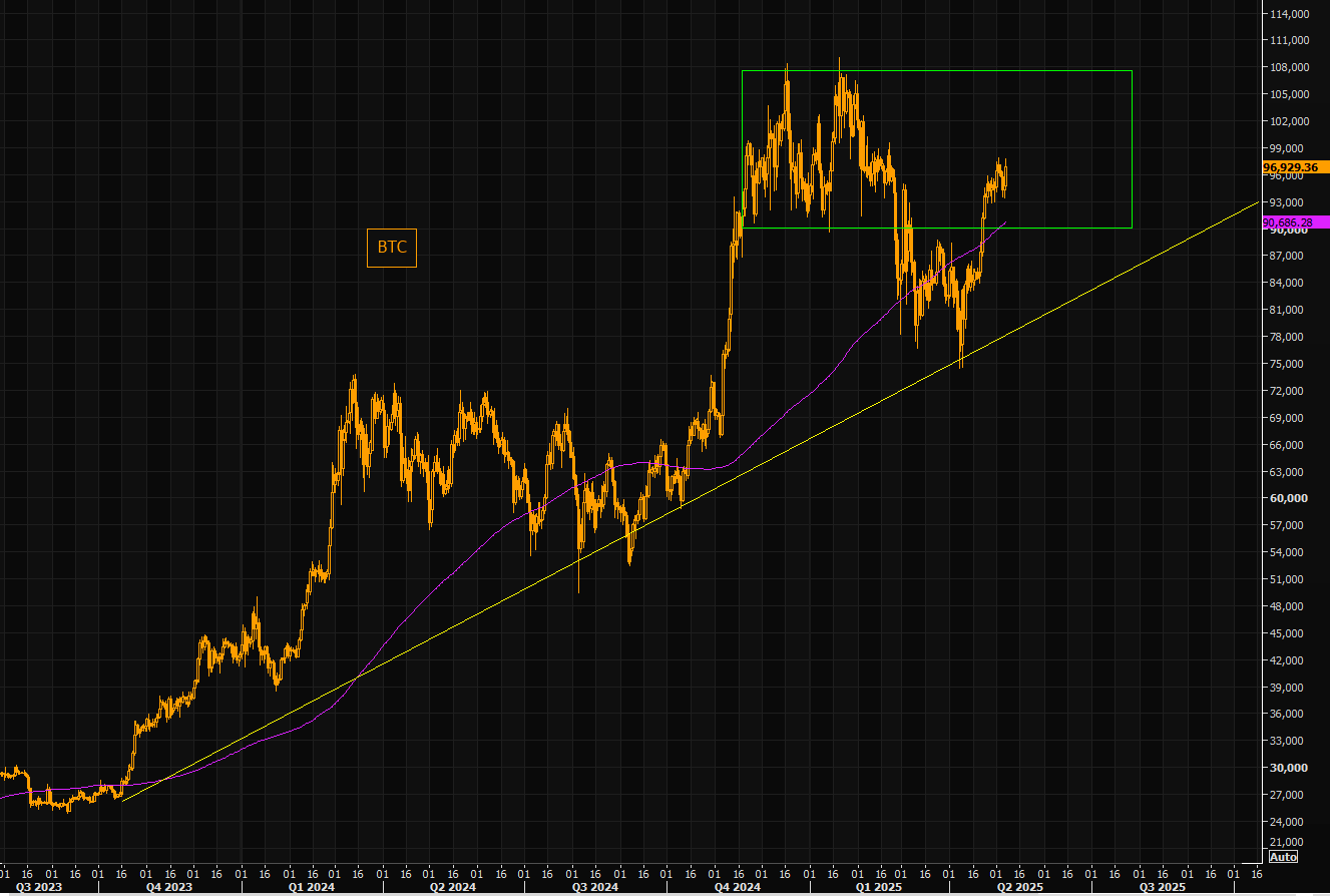Bitcoin is trying to take out new recent highs, but zoom out and you realize we remain stuck in a big range. 200 day around the 91k level.