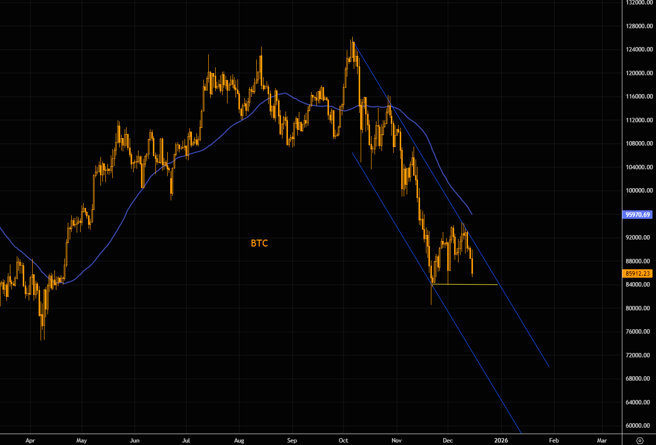 Bitcoin continues trading inside the perfect trend channel that has been in place since ATHs. 50 day is way higher. 84k is the short term make or break level.