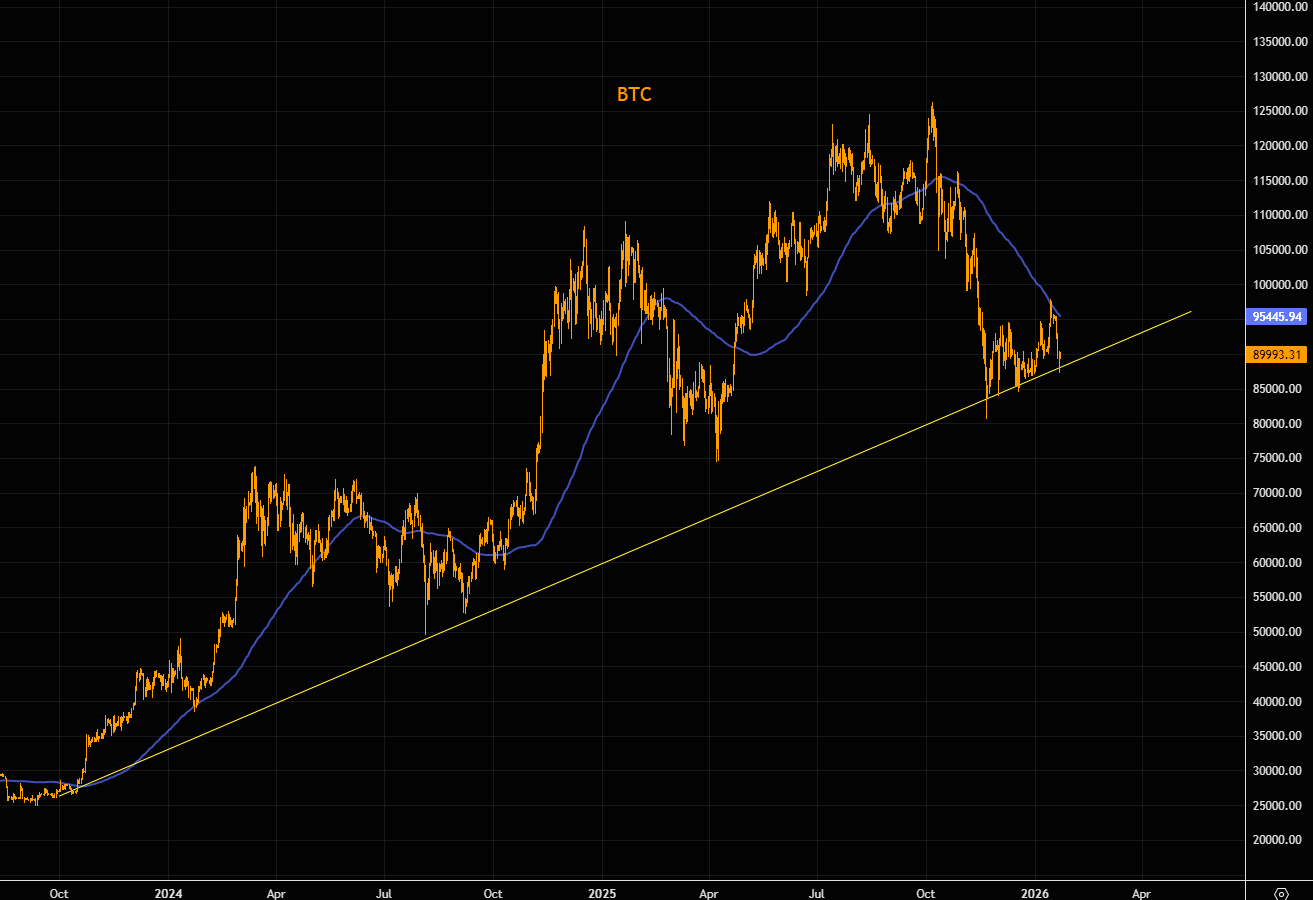 BTC continues to trade somewhat heavy. The breakout above the range was aggressively reversed right at the 100-day MA, and BTC is now sliding back toward the lower end of the range. A major trend line converges near current levels. $85k is the clear make-or-break zone to watch.