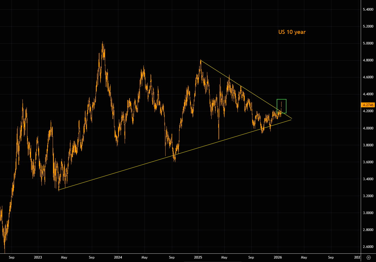 US 10 year breaking big above the huge wedge/triangle like formation. This still lacks a longer term trend, but the latest squeeze is taking a lot of people by surprise.