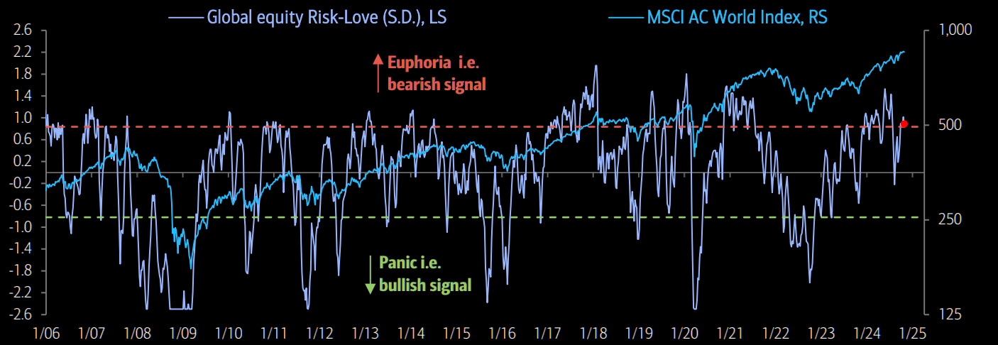 BofA's risk-love sentiment index has grown in confidence to "borderline euphoria" levels lately. Bullish is not unique here...