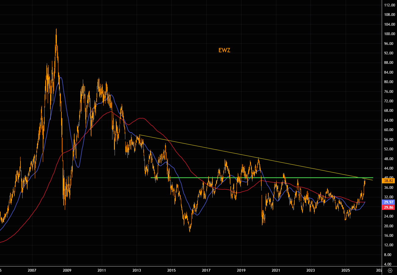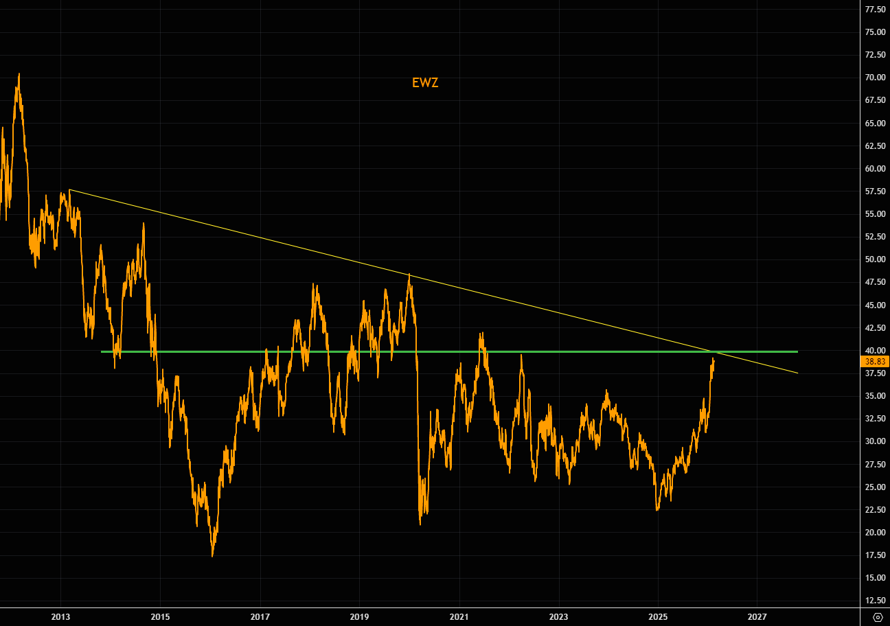 A little over a year ago, we flagged Brazil as one of the most bombed-out assets to watch. Since then, EWZ has surged, effectively going vertical, highlighted by the aggressive gap higher in mid-January. The fundamental story remains intact, but EWZ is now approaching a significant resistance zone just overhead. More recently, we’ve also learned that legendary investor Stanley Druckenmiller has been building a position in EWZ over the past several months. How do you play it from here?