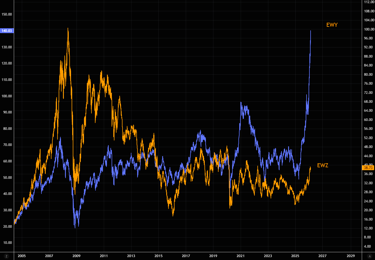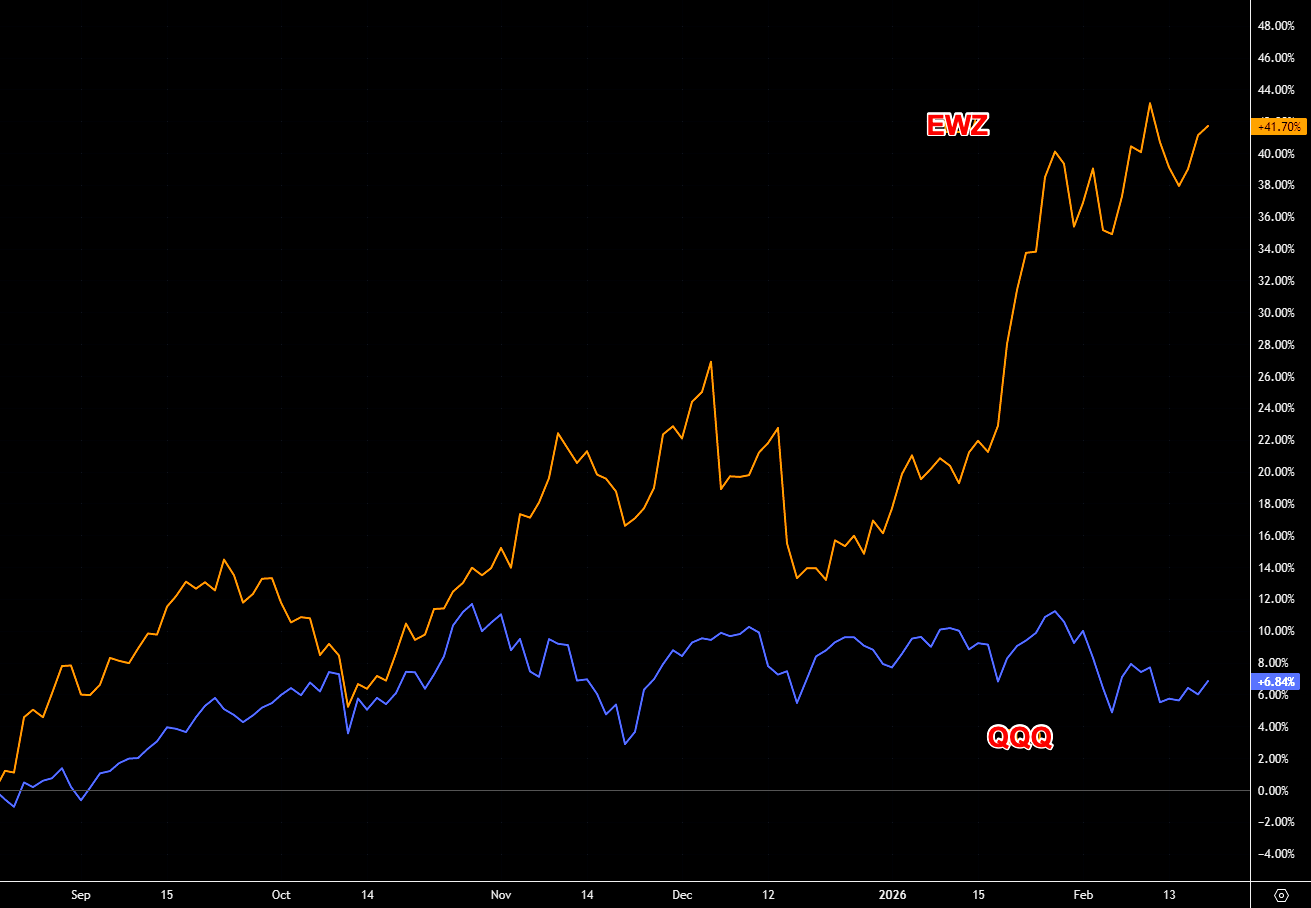 Performance over the past 6 months: EWZ +42%, QQQ +7%.