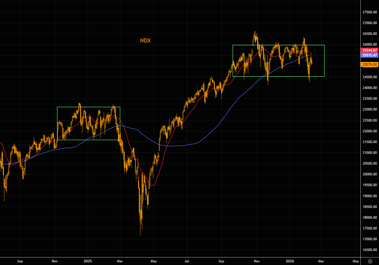 NDX is still trapped inside the range that has defined price action for months. We’re now trading below the 100-day, with the 21-day curling down and on the verge of crossing it, not exactly constructive. The setup is starting to look eerily similar to last year’s pattern.