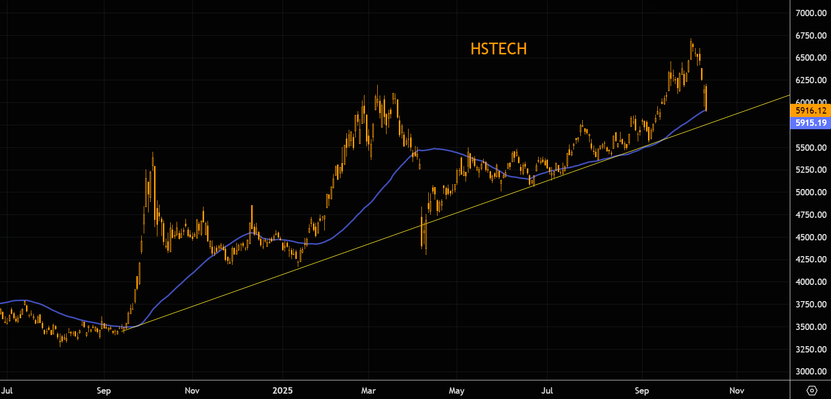 HSTECH has sold off aggressively since recent highs, putting in the biggest down candle in a long time overnight. Note we closed right on the 50 day. The longer term trend line comes in slightly lower.